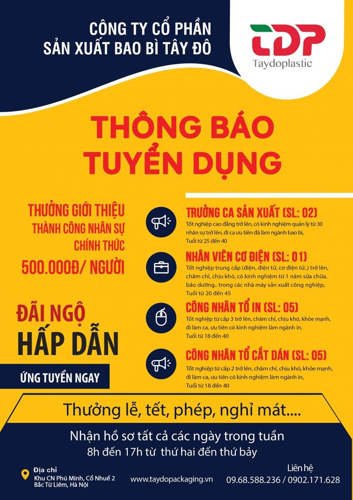 THÔNG BÁO TUYỂN TRƯỞNG CA SẢN XUẤT, CƠ ĐIỆN, CÔNG NHÂN 27/09/2022 CÔNG TY CỔ PHẦN SẢN XUẤT BAO BÌ TÂY ĐÔ 0 Nhận xét